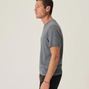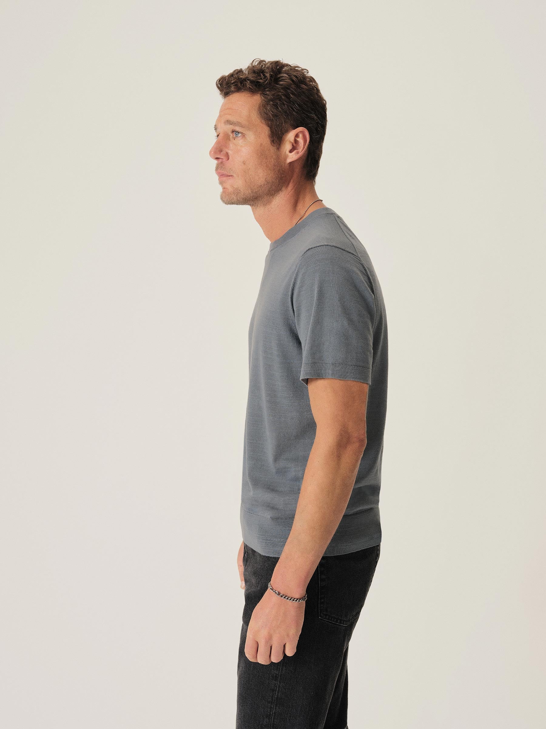 Classic fit short sleeve sweater tee with a straight hem. Yarn-dyed 16 gauge cotton jersey features light slub texture. Features double layer 1×1 ribbing at the collar and rib finishing at the cuffs and hem. Constructed with hand-linked seams for improved durability.