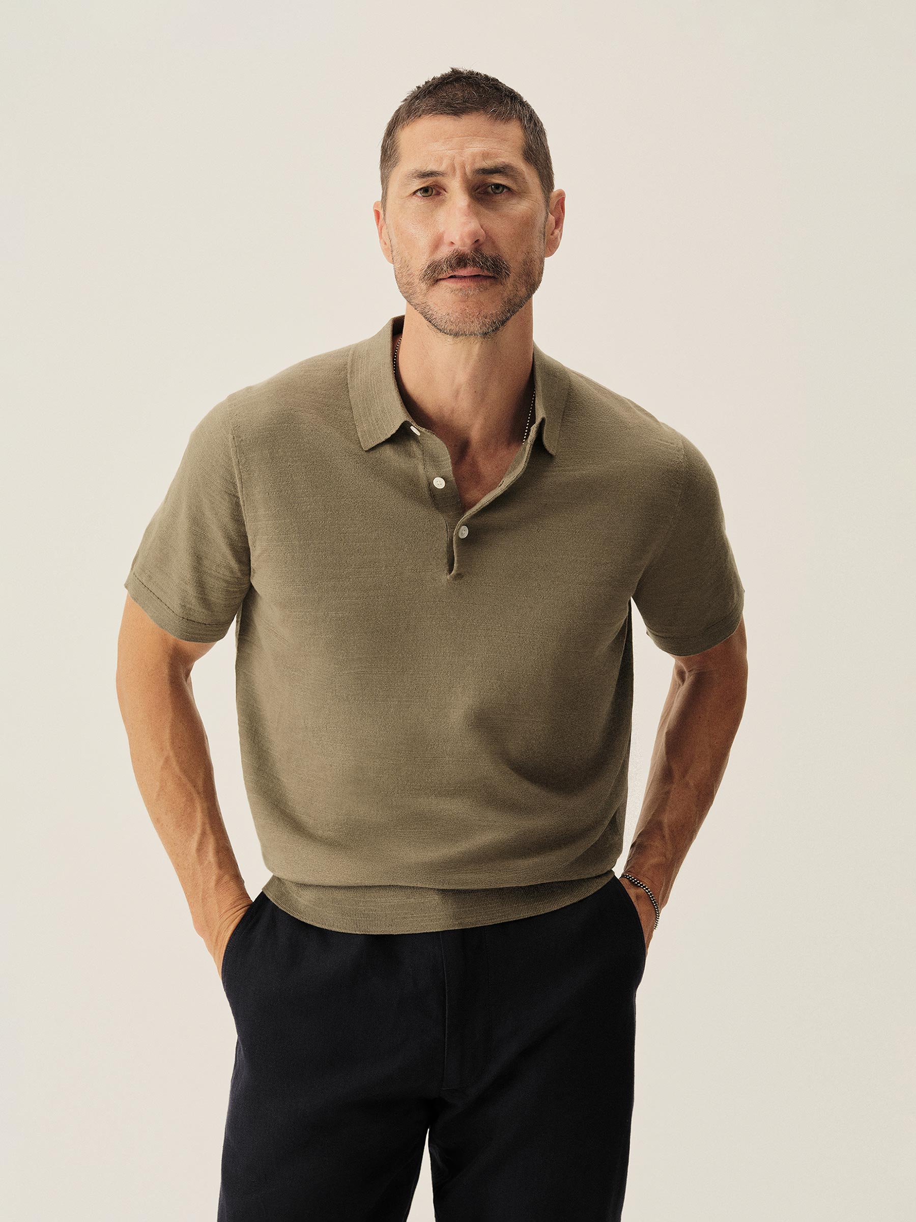Classic fit sweater polo in yarn-dyed 16 gauge cotton jersey with light slub texture. Features a three-button closure and rib finishing at the cuffs and hem. Constructed with hand-linked seams for improved durability.