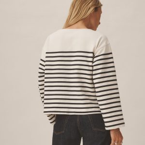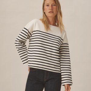Relaxed long sleeve boatneck tee inspired by the classic French breton shirts. Cut from sturdy, compact 350 GSM cotton. Details include a taped boatneck neckline and side slits at the hem. Constructed with flatlock stitching throughout and double needle coverstitching at the hem. Garment washed for a lived-in feel.