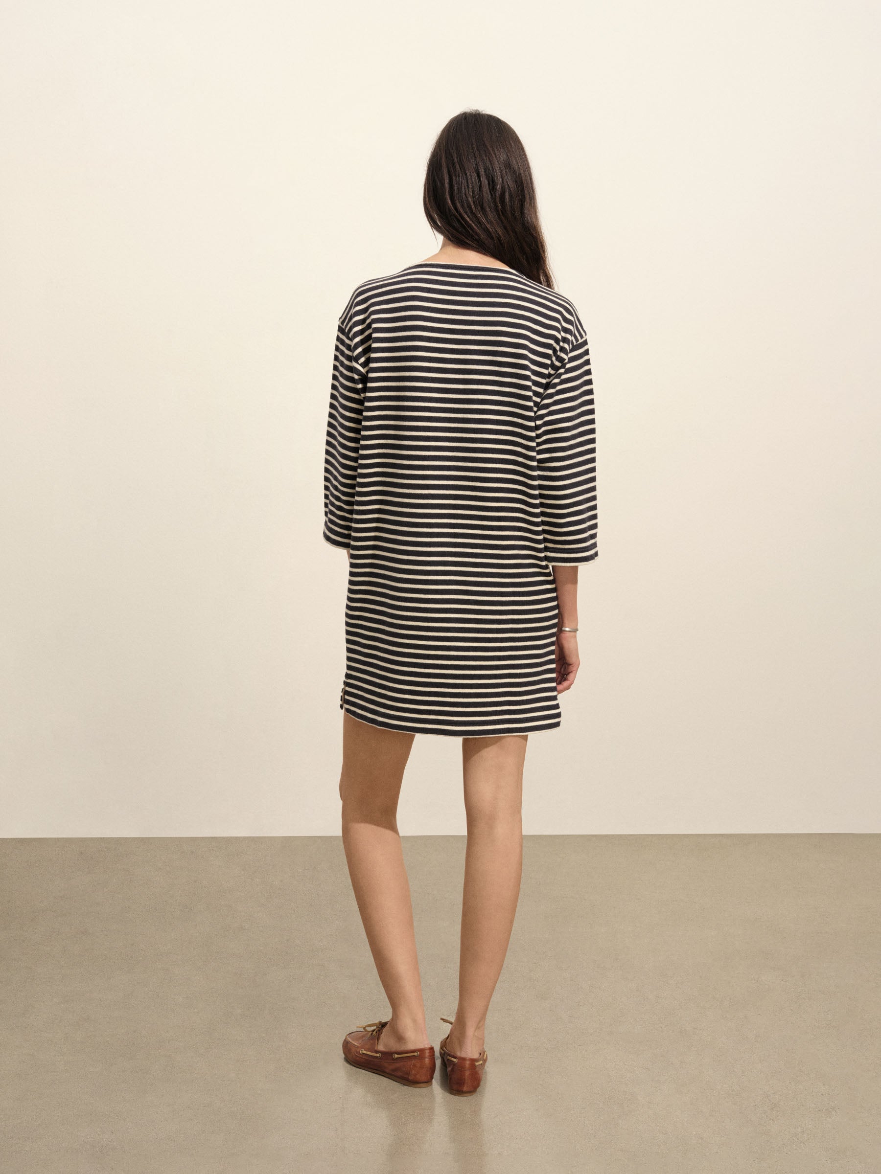Inspired by classic French Breton stripe shirts, a relaxed boatneck shift dress with long sleeves, made from heavy cotton jersey. Detailed with herringbone tape along the side slits and neckline and finished with a garment wash for a soft, broken-in feel.