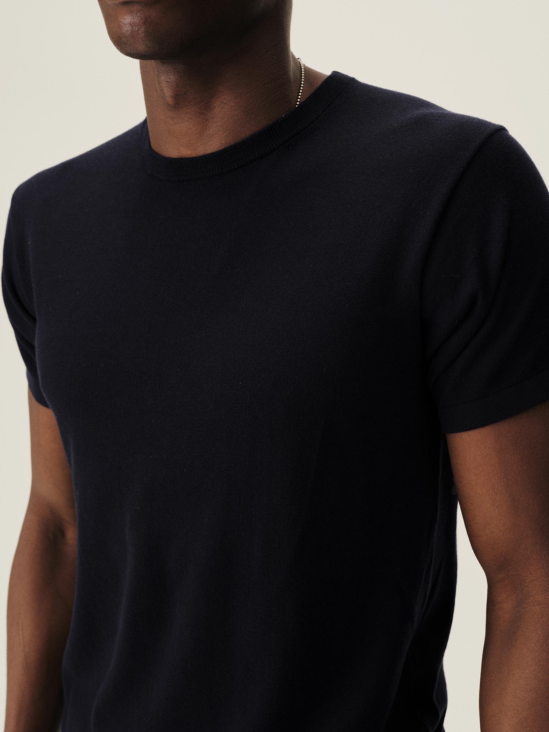 A fully fashioned tee that draws inspiration from the lifestyle surrounding Lake Como in the 1960s. Knit from an ultrafine blend of yarn-dyed organic Egyptian cotton and cashmere, spun in Italy. Featuring tubular finishes at the cuffs and bottom hem, and a shallow sleeve cap.