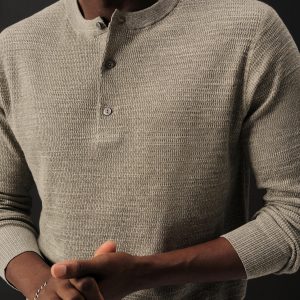 A standard fit, vintage-inspired thermal stitch henley crafted from slubby, yarn-dyed cotton. Featuring variegated rib finishes at the cuffs and bottom hem, and coverstitching along the seams. Finished with a three button shell closure.