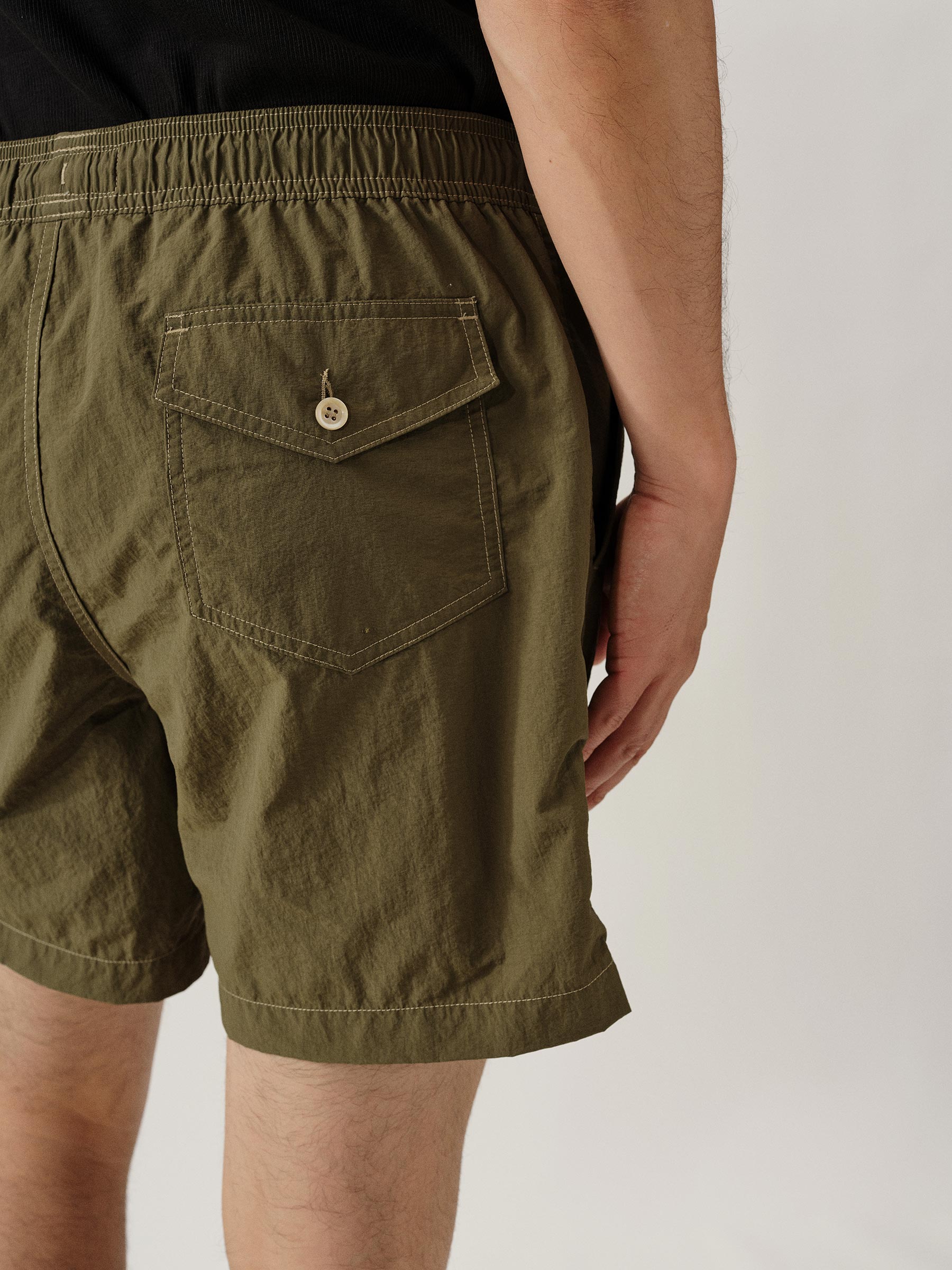 Classic swim shorts are made from lightweight woven nylon using recycled plastic waste found in the ocean. They feature an elastic waistband with an added drawstring for the perfect fit. A small front buttoned pocket and button flapped back pocket help you stow your necessaries in addition to two front slash pockets. 5.5-inch inseam.