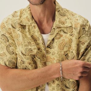 Classic fit short sleeve camp shirt cut from a 5.25 oz. yarn-dyed linen blend with a subtle luster and relaxed drape. Features a six-button placket with mother of pearl buttons, twin patch-and-flap chest pockets, straight hem, and a loop and button closure at the neck. Constructed with clean finished seams. Garment washed with enzymes for a lived-in feel.