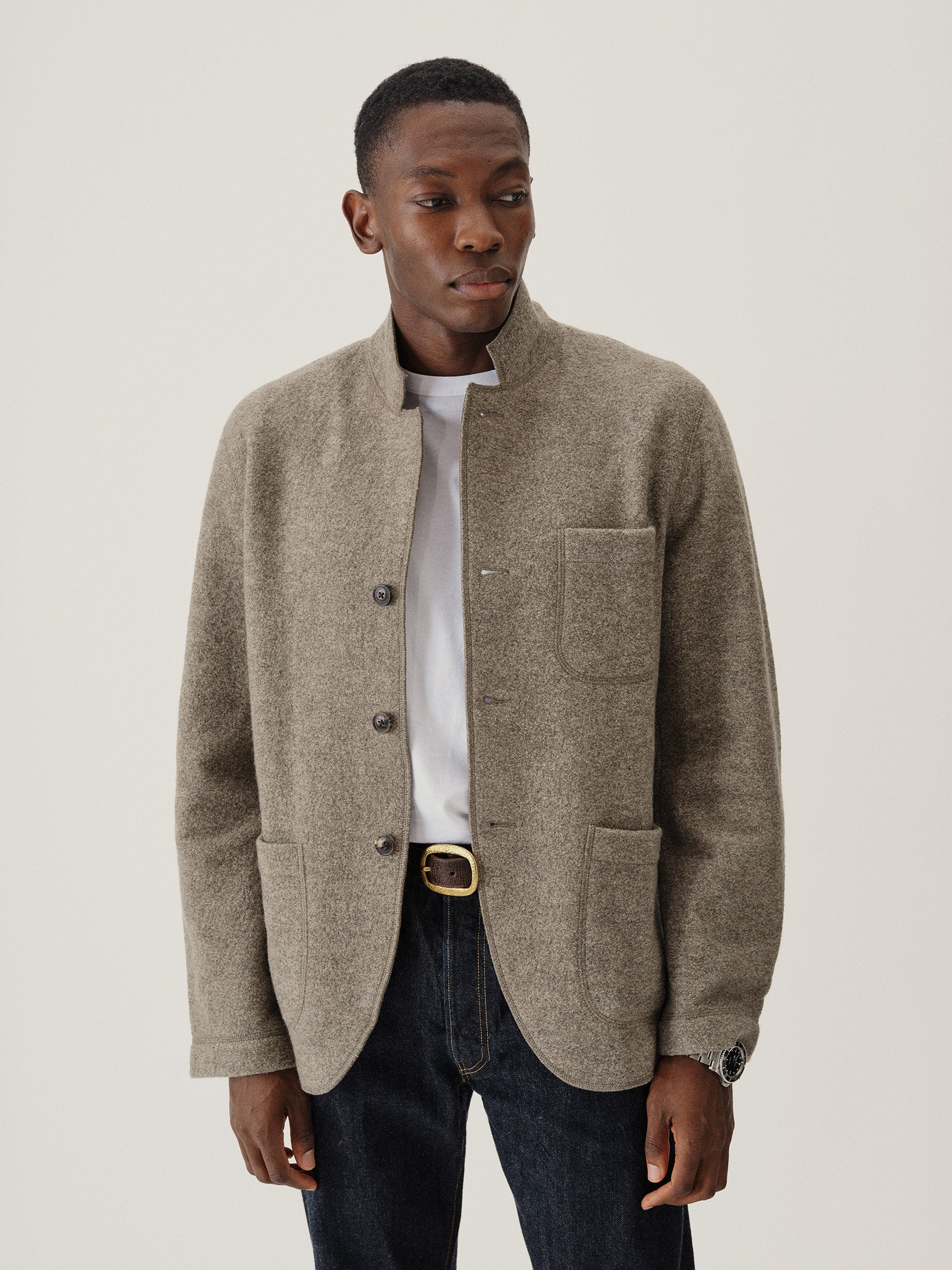Classic fit chore coat with a slimmer cut through the arms and room in the torso for layering. This 340 GSM felted merino wool has been twice boiled for improved insulation and durability. Details include three patch pockets, real horn buttons, and a notch collar. Constructed with hand-sewn facings and cover-stitching throughout.