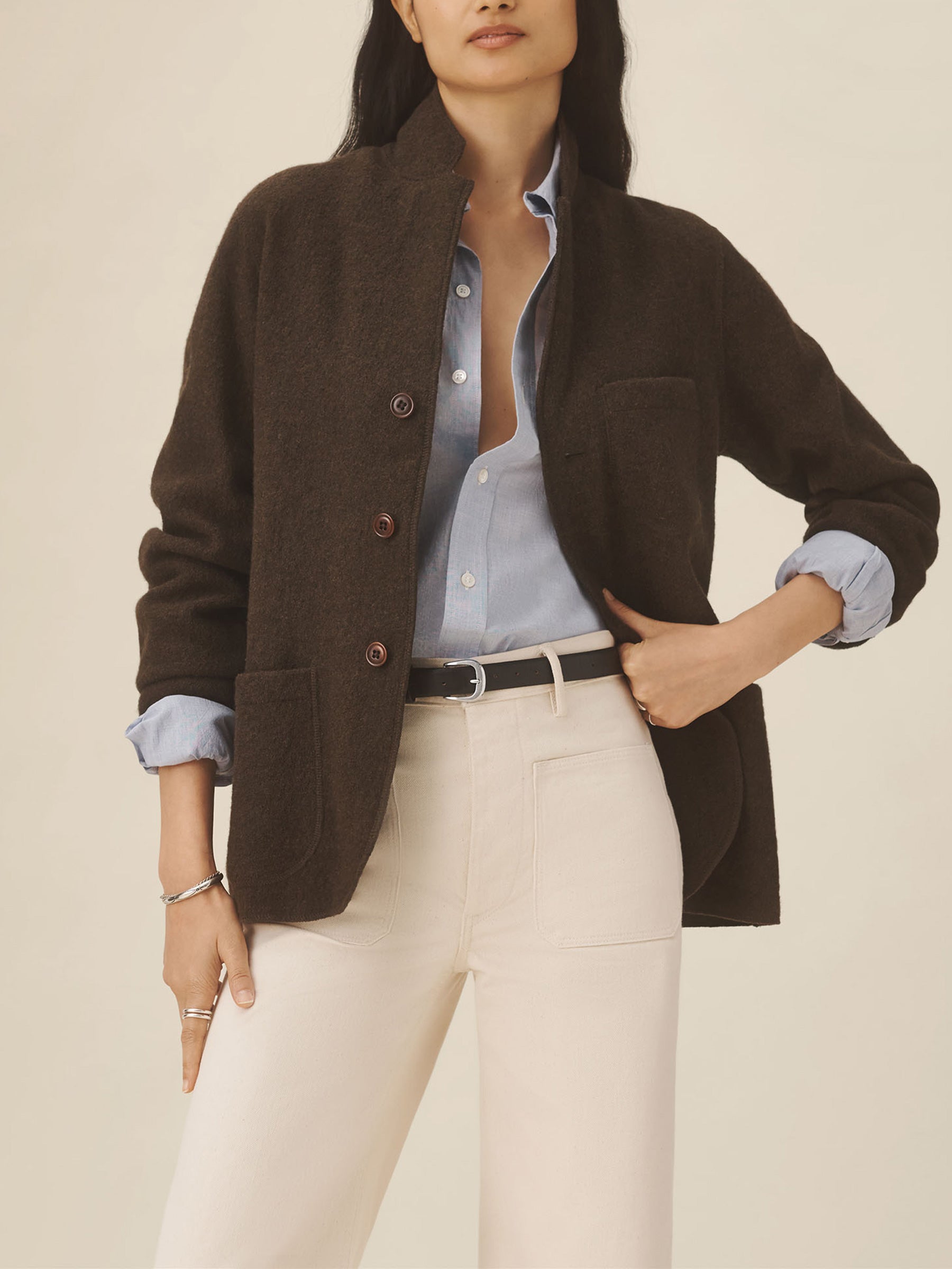 Classic fit chore coat with a slimmer cut through the arms and room in the torso for layering. This 340 GSM felted merino wool has been twice boiled for improved insulation and durability. Details include three patch pockets, horn buttons, and a notch collar. Constructed with hand-sewn facings and coverstitching throughout.