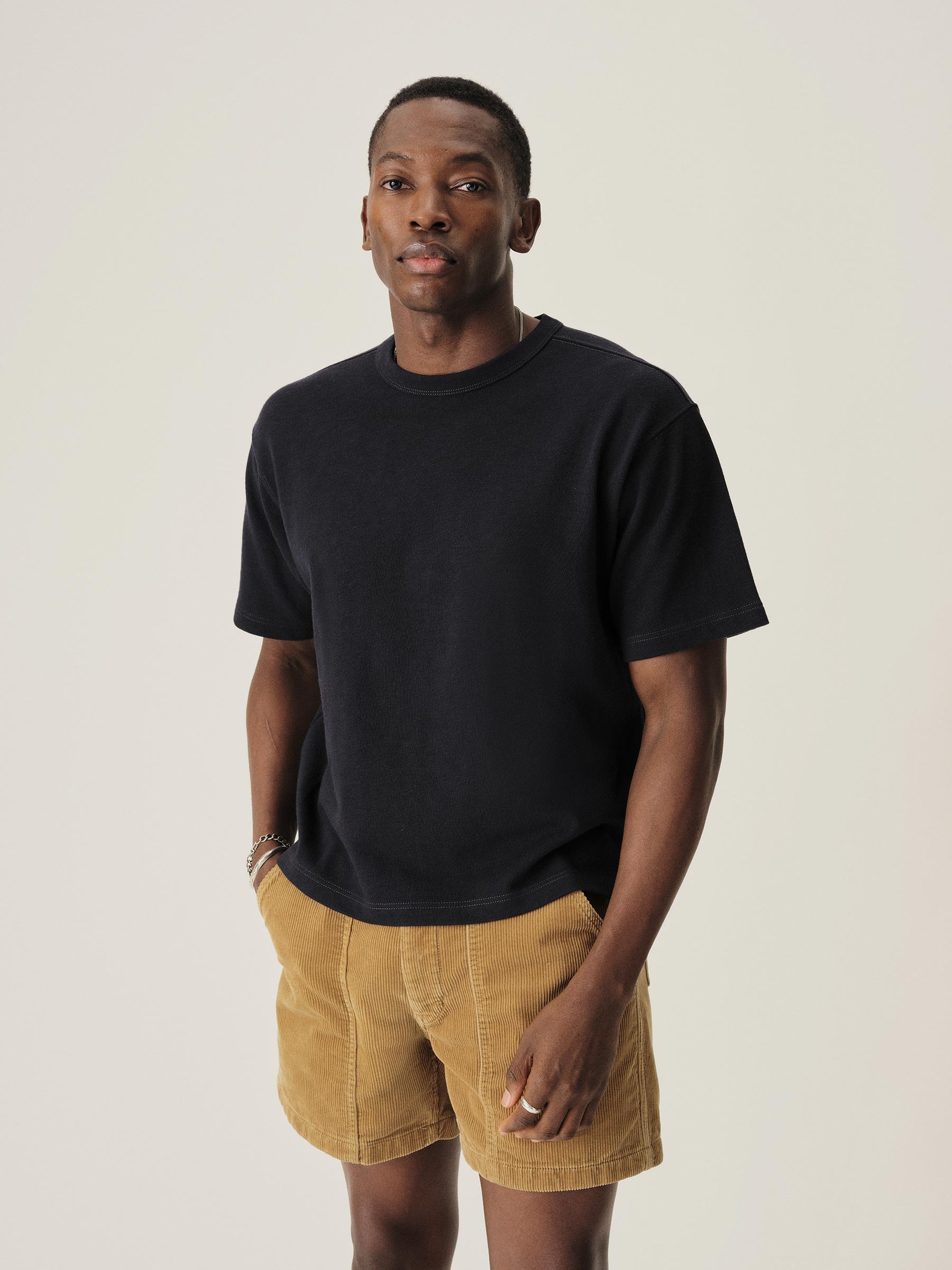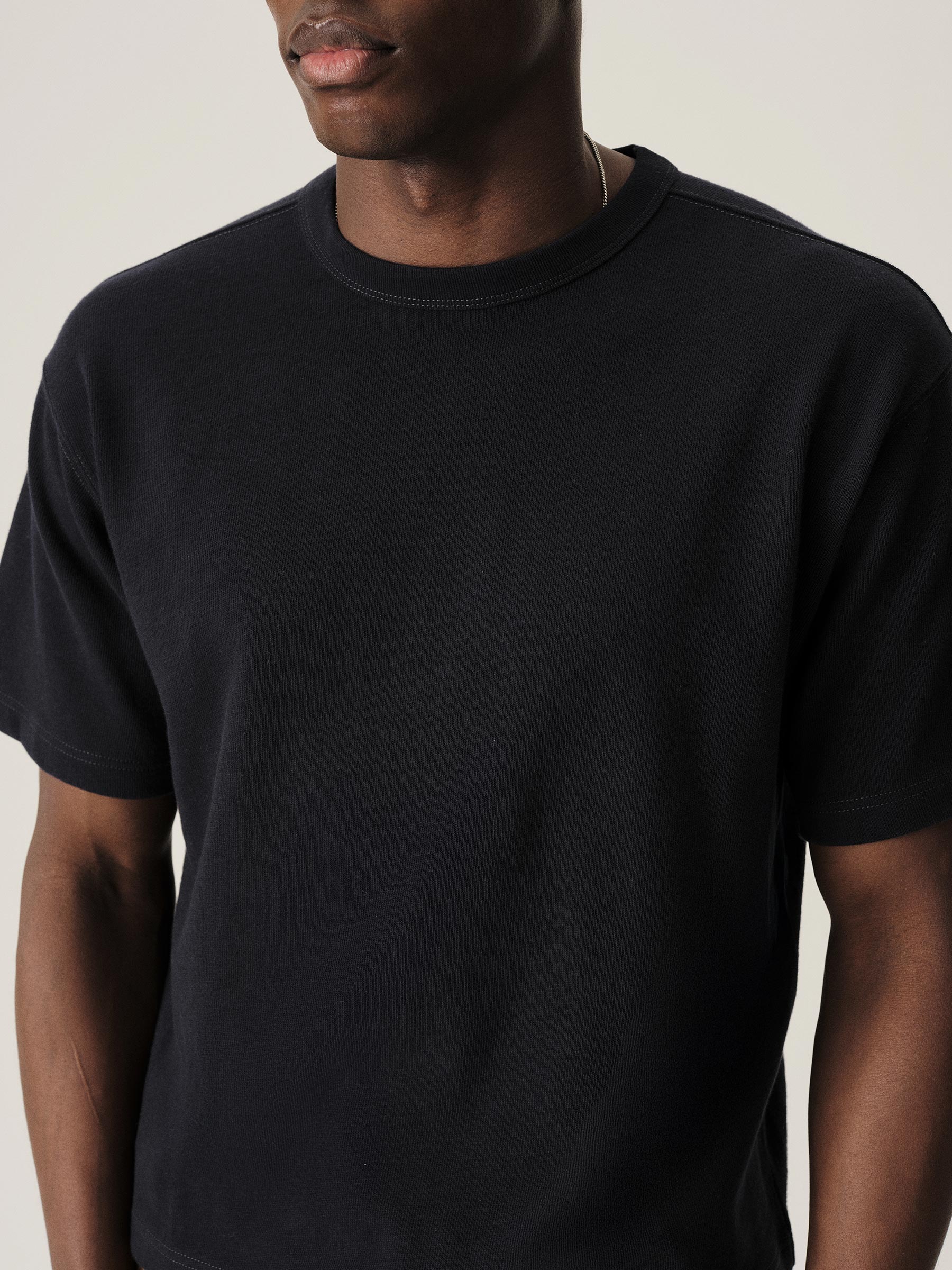 Cut from a substantial and soft, 310 GSM cotton jersey, this 90s-inspired boxy crewneck tee has a straight hemline, longer sleeves that hit lower on the bicep, and a wide-ribbed collar. It features a bound neck with a woven label, and is constructed with a split-needle cover stitch at the shoulders and armholes. Double-washed for a soft, smooth texture and a consistent fit.