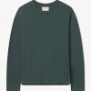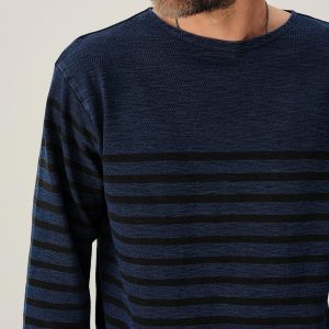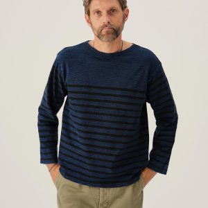 Nautical-inspired boxy fit short sleeve wide neck tee with a straight hem, longer sleeve length, drop shoulder, high neck, and wide ribbed collar. The soft cotton jersey, yarn-dyed in indigo and black sulfur stripe pattern, is about twice as heavy as our Pima tees, with tiny vertical ribs that gently glide across the skin. This is a solid, substantial stand-alone tee for cold weather that will pick up a ton of character over time.