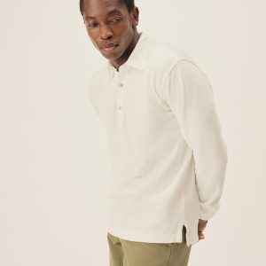 Classic fit long sleeve polo cut from yarn-dyed 310 GSM cotton jersey with the weight and durability of vintage rugby cloth. Details include a stepped hem with side seam vents, a three-button placket with shell buttons, and ribbing at the cuffs. Garment washed for a lived-in feel.