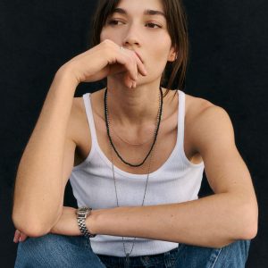 Slim-fit, vintage-inspired base tank made from a textured blend of 60% recycled cotton and 40% cotton. Features a scalloped scoop neckline, contrast rib binding, and discreet baby snaps at the shoulders to keep bra straps in place.