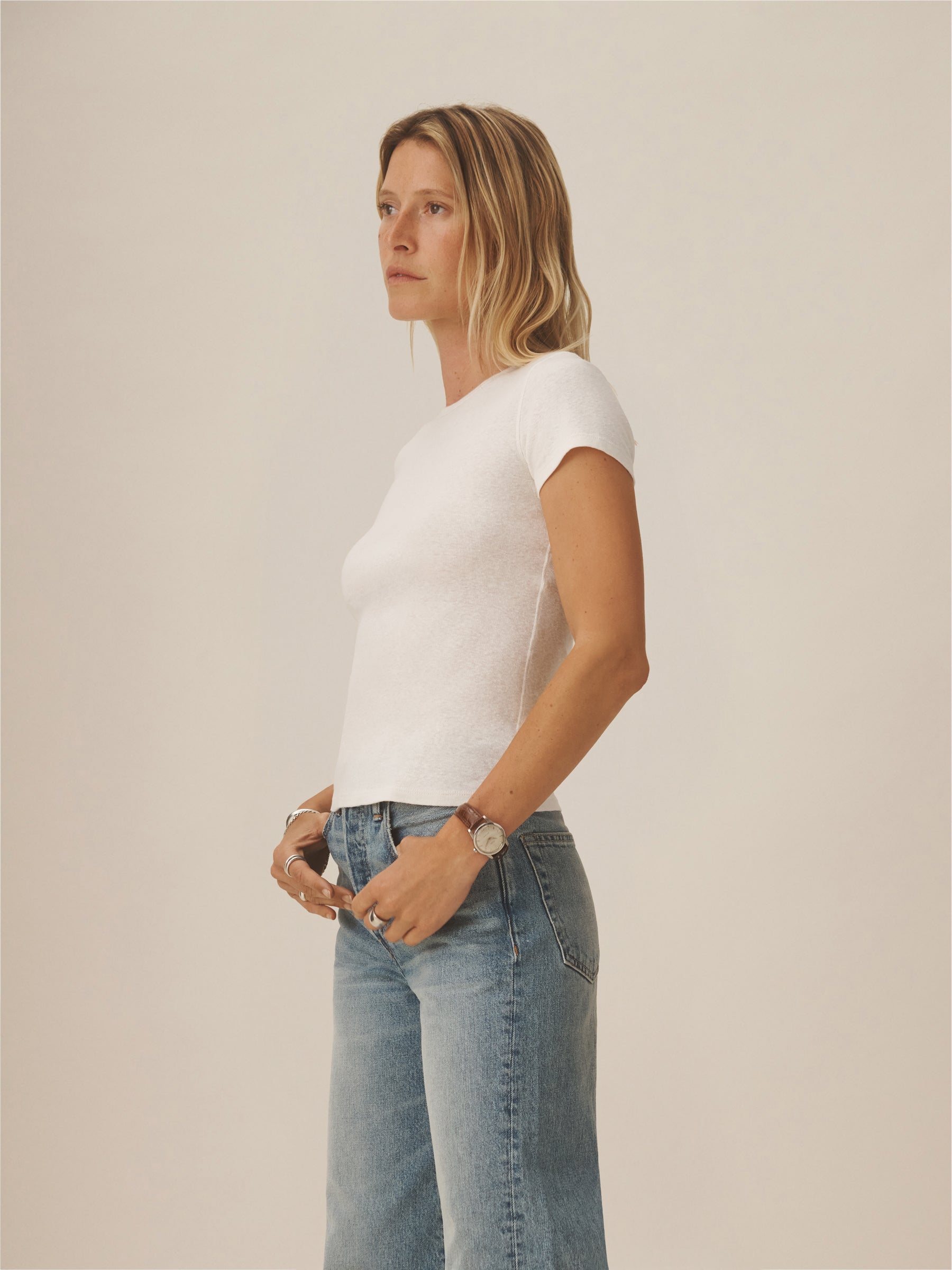 Our take on the classic baby tee, crafted from a superfine blend of new and recycled cotton with a subtle, textured rib. Garment washed for a lived-in look and feel.