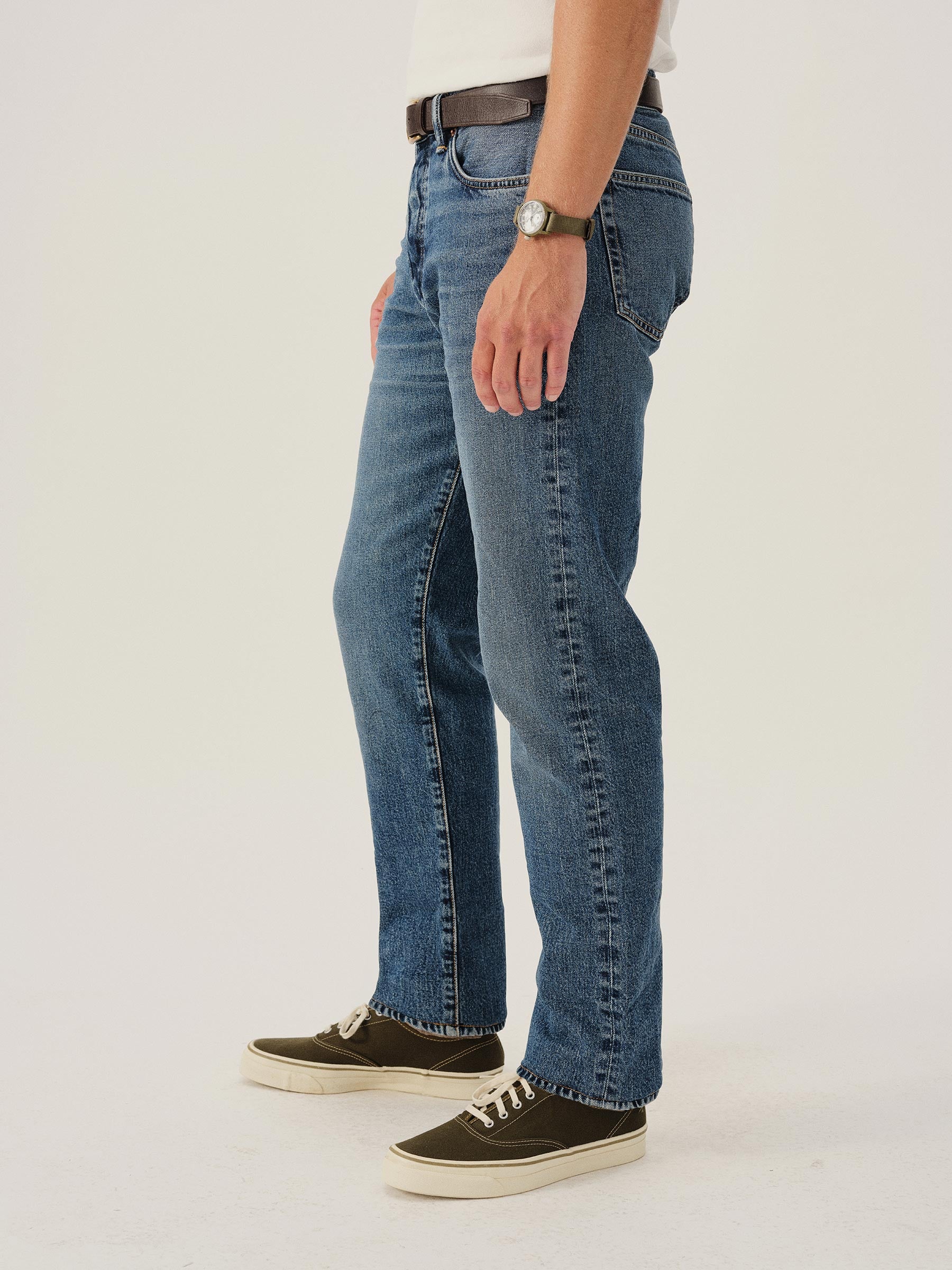 A classic 5-pocket jean in our Ford Standard fit: mid-rise, straight through the thighs with a taper below the knee. Inspired by our favorite vintage jeans, this 14 oz denim from Japan-based Kaihara mills has a hint of stretch and an organic texture that develops more character with every wear. Garment rinsed for a lived-in feel. Details include copper rivets and a metal tack button fly.