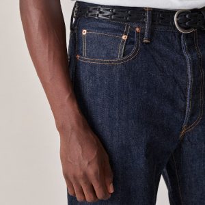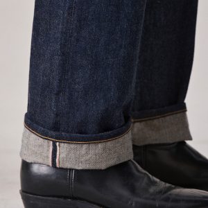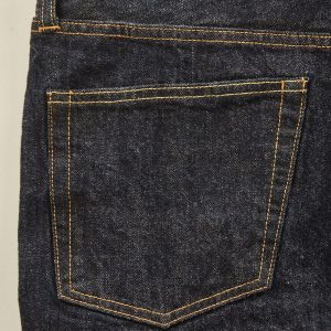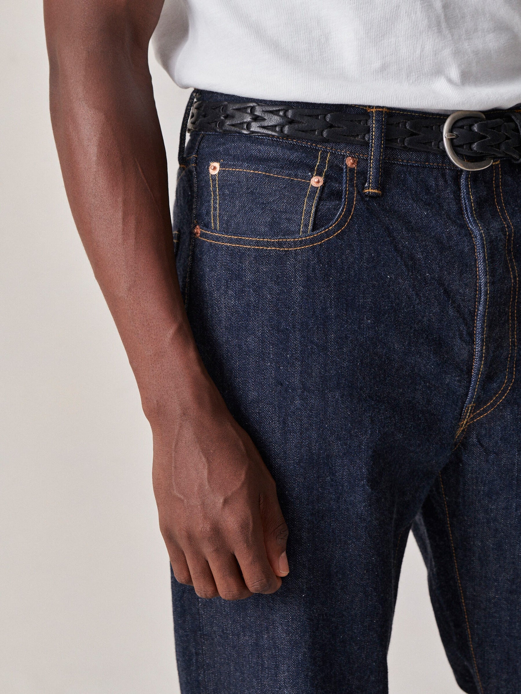 A classic 5-pocket jean in our Full Saddle fit: high-rise, straight through the thigh and leg. Inspired by blue jeans from the 1940s through the 1960s, this shuttle loomed 14 oz. selvedge denim is unsanforized, and has an organic texture that develops more character with every wear. Garment rinsed for a lived-in feel. Details include copper rivets and a metal tack button fly.