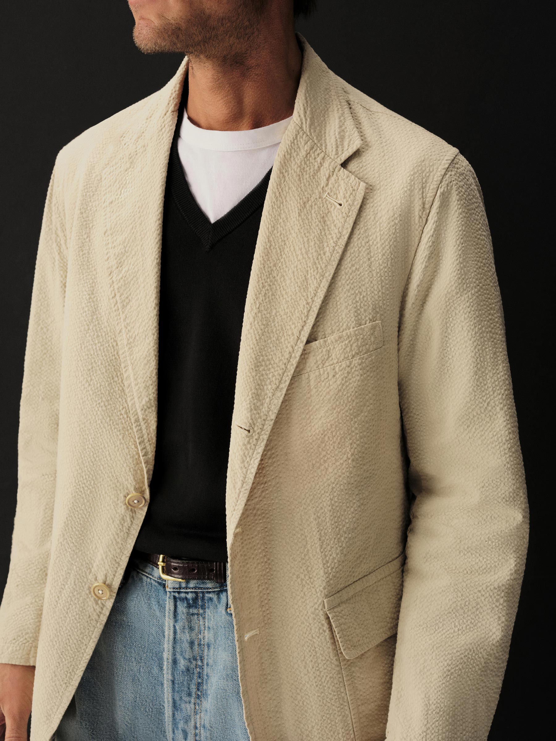 Tailored 3-roll-2 button blazer inspired by timeless vintage suiting. This 5 oz cotton seersucker has a rippled texture that wicks moisture and maintains airflow making it ideal for warmer climates. Details include two patch pockets, two internal welt pockets, and a notched lapel. We left it unlined and omitted the back vent and cuff buttons for a casual, streamlined look. Constructed with hand-linked seams and garment washed with enzymes and softener for a lived-in feel.