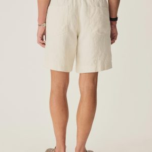 Classic fit fatigue short. This 7 oz. linen has a loose, airy weave that breathes easily, and it’s been washed for a lived-in feel. Details include two front patch pockets, two back patch pockets, an encased elastic waist with drawcord, and corozo buttons. Garment washed with enzymes and softener for a lived-in feel. Button and zip closure.