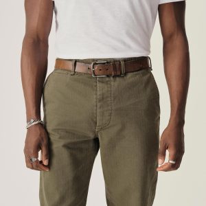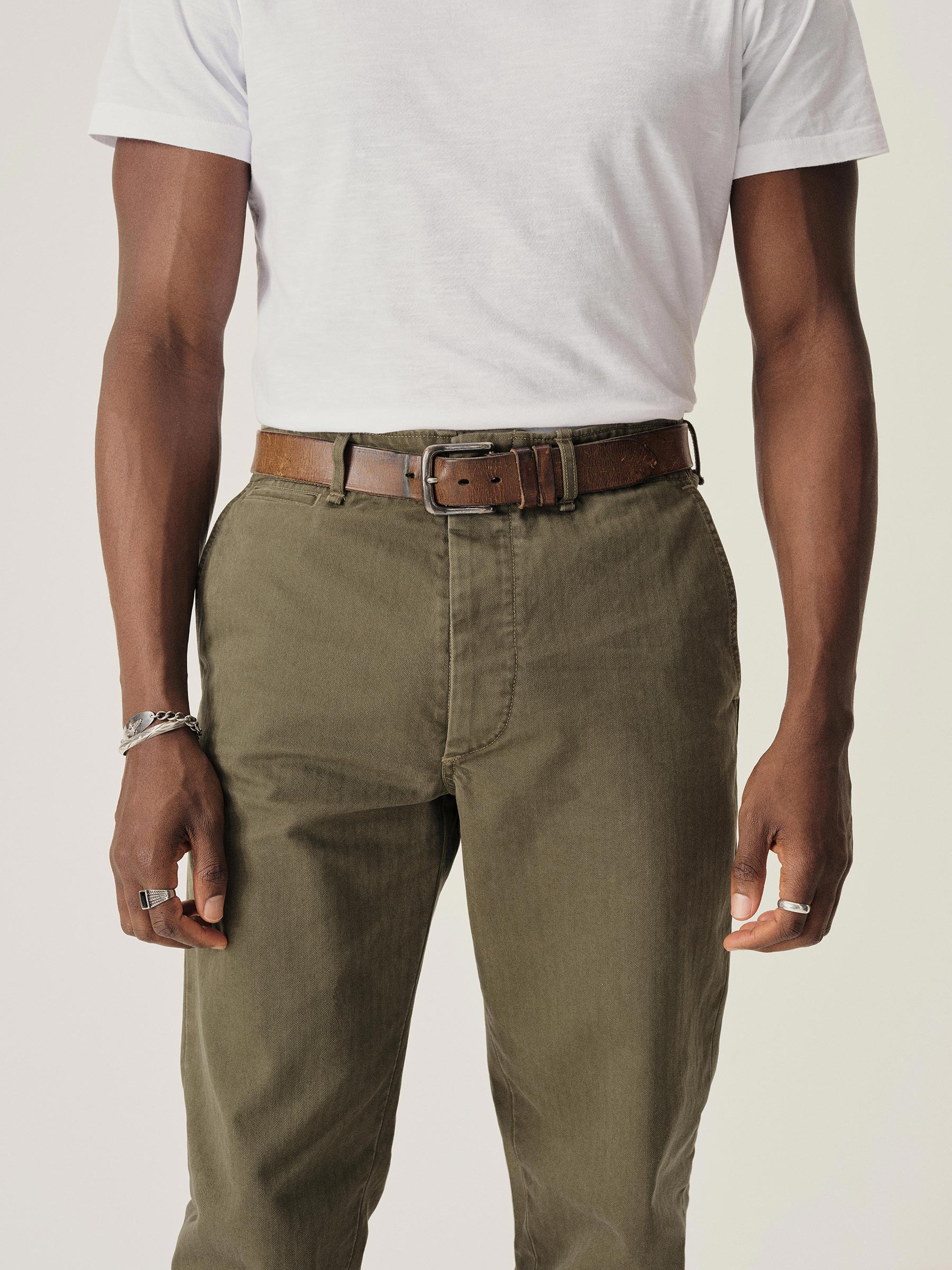 The classic officer’s pant in our Maverick Slim Fit: mid-rise, slim through the thighs with a taper below the knee. Cut from a midweight cotton HBT that’s been washed to achieve the same look and feel of vintage service uniforms. Featuring a one-piece “Hollywood” waistband, slash front pockets, welted back pockets, and a welted coin pocket. Finished with real corozo buttons. Garment washed for a lived-in feel. Button fly.