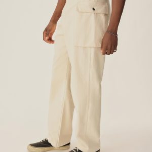 Inspired by the Herringbone Twill – or HBT – fatigue trousers worn by the US Army in WWII, these pants feature two cargo pockets high on the hips, close to the waistband. The pockets are made with an expandable gusset that allows them to keep a low profile while still being able to stow anything you need. The fit is relaxed with room in the leg and seat to accommodate the side pockets. The buttons are metal tack buttons featuring a 13-star design on the top – one for each of the original colonies.