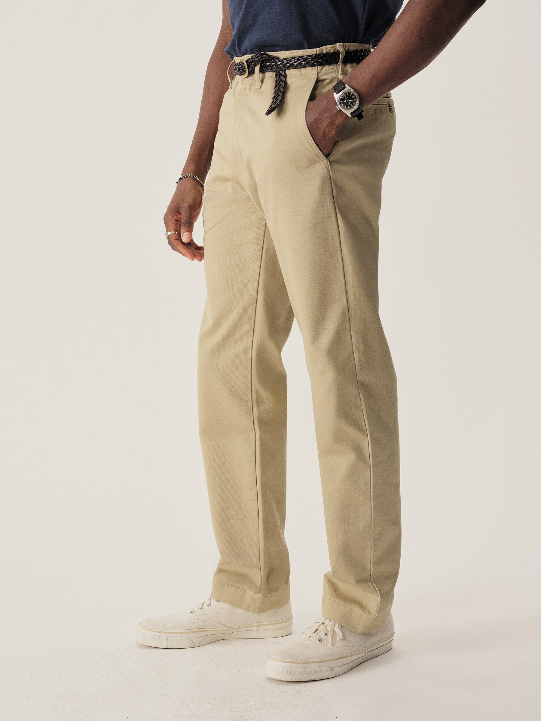 The classic officer’s pant in our Ford Standard fit: mid-rise, straight through the thighs with a taper below the knee. Cut from 9.5 oz cotton twill that has been washed to achieve the same look and feel of vintage service uniforms. Features a “Hollywood” one-piece waistband construction, slash front pockets, buttoned flap back pockets, and a welted coin pocket, natural canvas interior detailing, and real corozo buttons. Garment washed with enzymes for a lived-in feel. Zip fly.