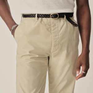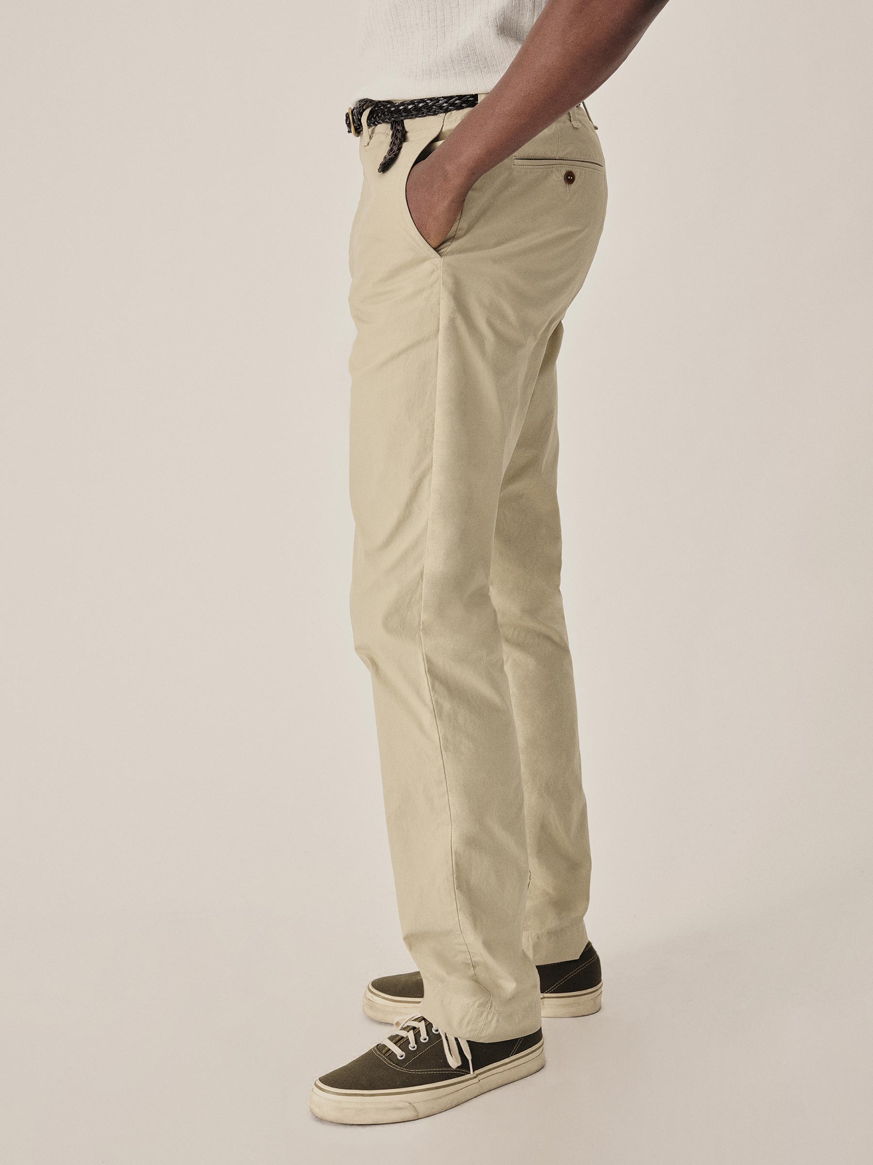The classic officer’s pant in our Maverick Slim fit: mid-rise, slim through the thighs with a taper below the knee. Cut from 5.5 oz. cotton poplin with a crisp hand and light structure that’s suitable for warmer climates. Features a “Hollywood” one-piece waistband, slash front pockets, welted back pockets, and a welted coin pocket. Lined with a natural canvas interior and finished with corozo buttons. Garment-washed for a lived-in feel. Button fly.