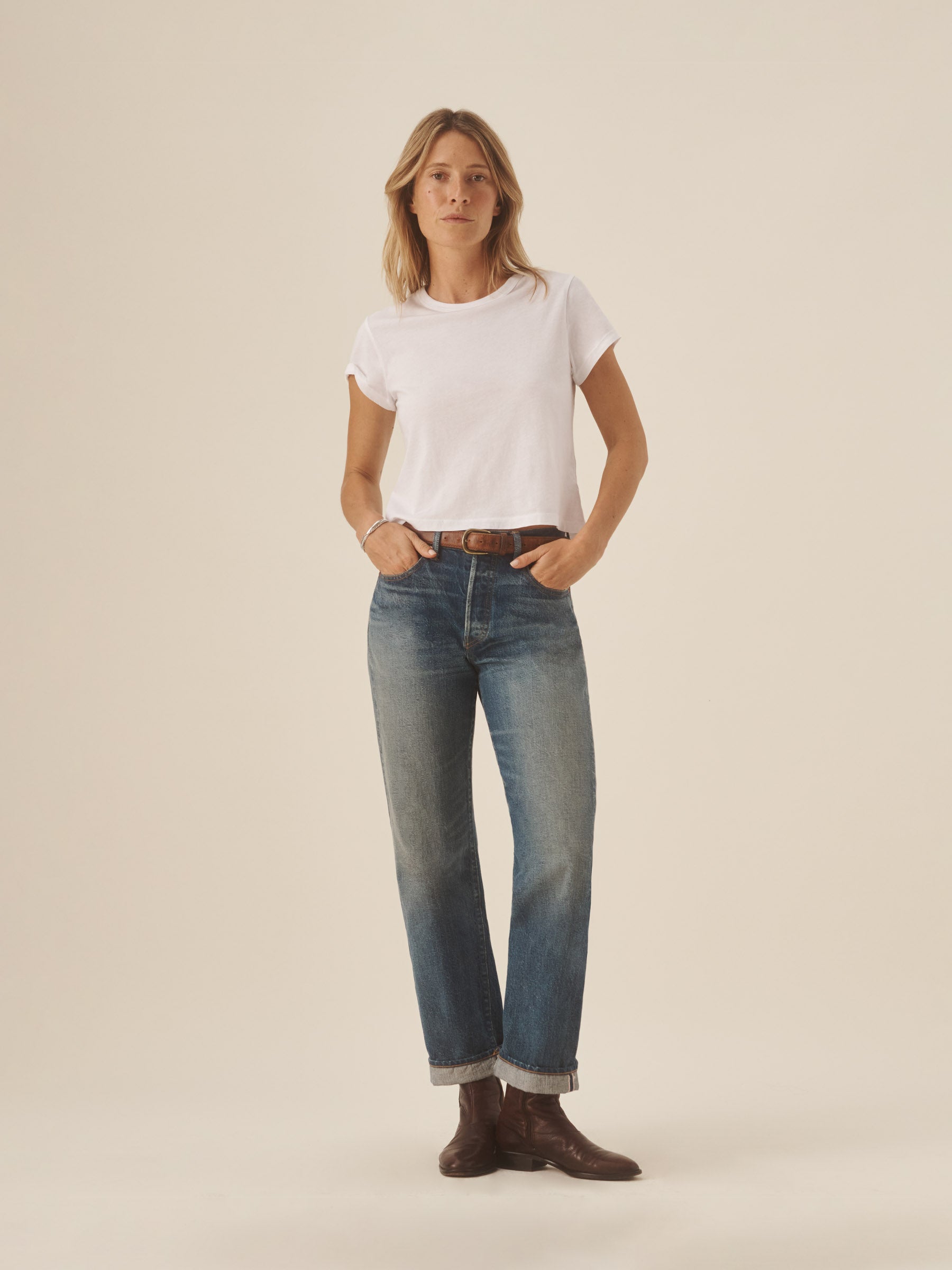 Boxy short sleeve crewneck tee with a straight hem. Cut from 120 GSM Supima cotton. Constructed with rib neck binding and double-needle cover-stitching at the hem. Garment washed for a lived-in feel.