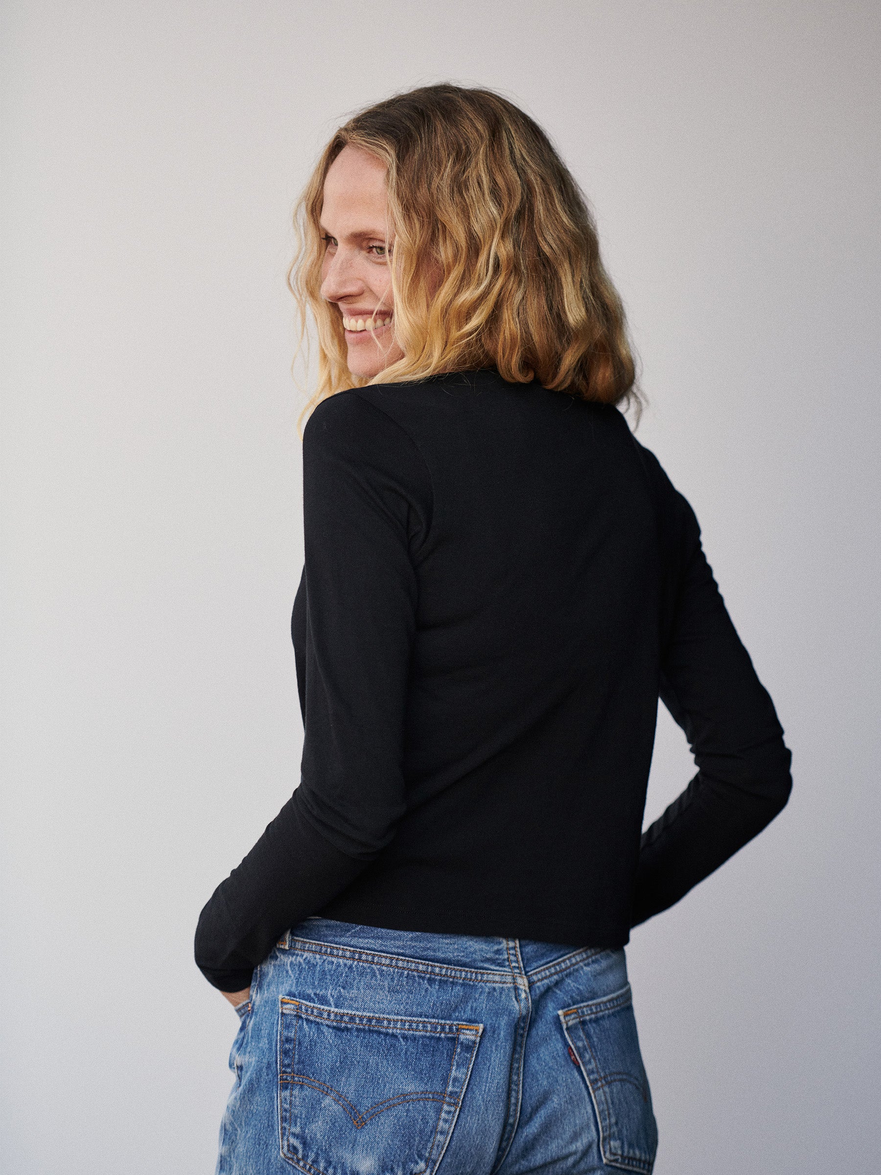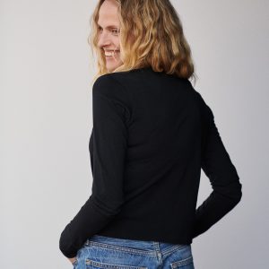 Boxy long-sleeve crewneck in a cropped 20” length that hits at the waist. Cut from 120 GSM jersey knit from long-staple Supima cotton. Features a ribbed neck and cover stitching at the hem. Garment washed for a lived-in feel. Grown and sewn in the U.S.A.