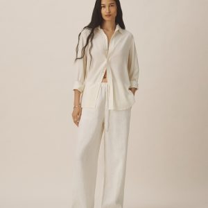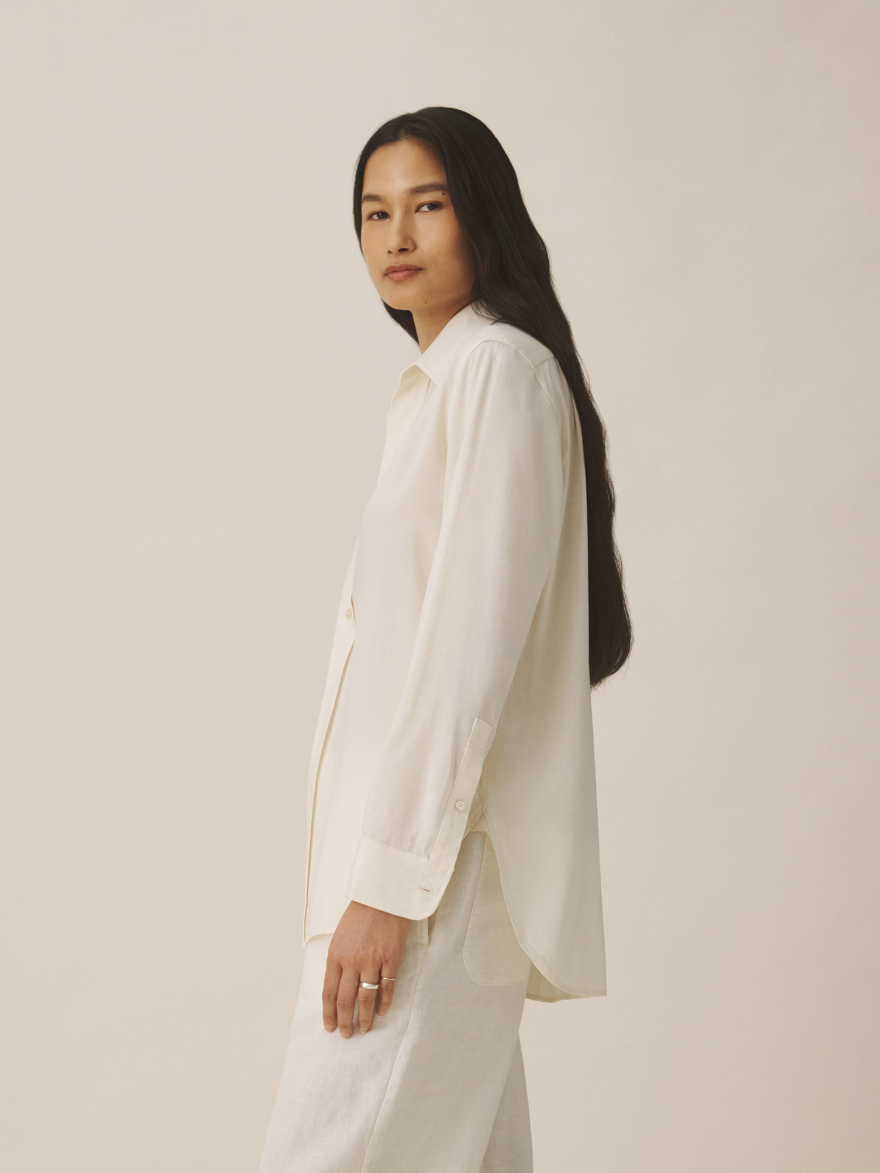A modern take on men’s sportswear shirts from the 1940s, a relaxed button-down shirt in a silky rayon jacquard weave. Featuring a carved collar, side-seam gussets, button-through plackets along shirt front and sleeves, and pintuck detailing on back yoke and sleeve cuffs. Finished with side-seam gussets and mother of pearl buttons.