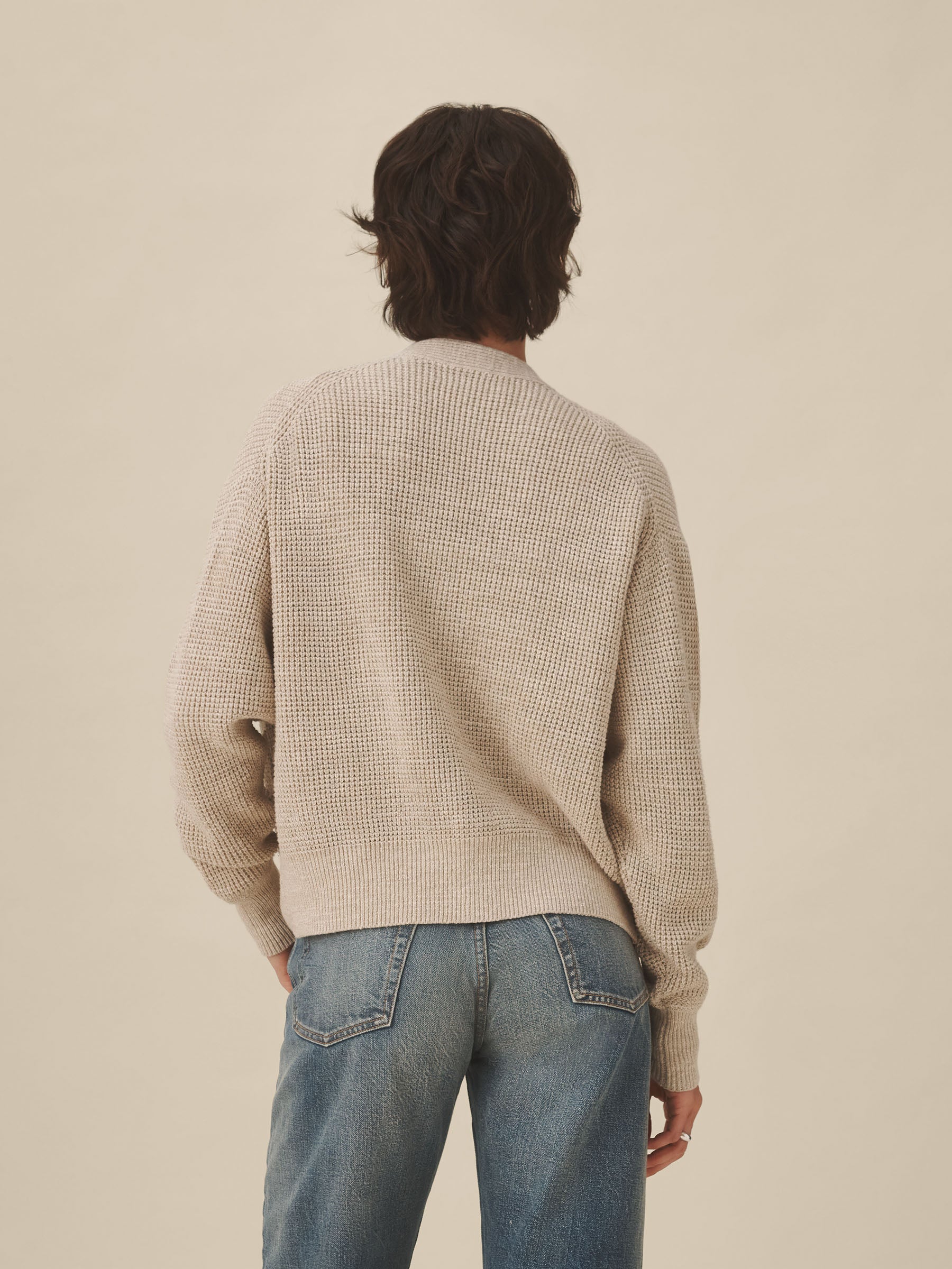 A relaxed cardigan made from marled cotton yarn and knit in a classic waffle stitch. Designed to layer over tees, it’s built with a functional front placket with urea buttons, patch pockets, and a clean V-neckline.