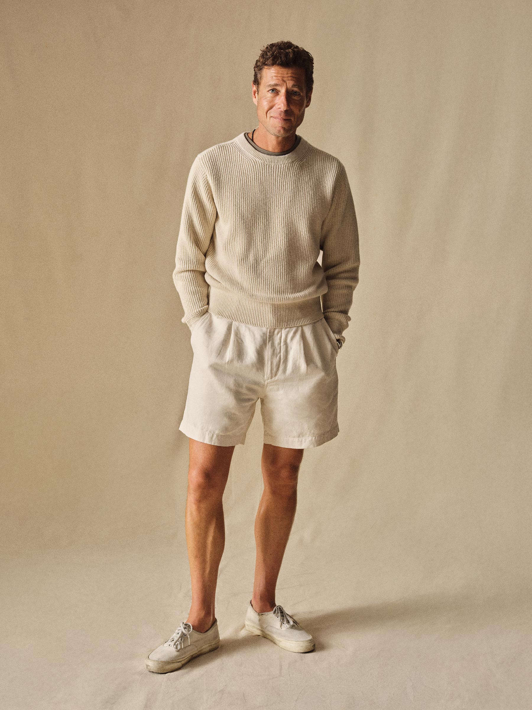 Classic fit crewneck sweater in a homespun textured cotton rib. Constructed with hand-linked seams, double layer ribbing at the collar, and racking stitch detailing at the cuffs.
