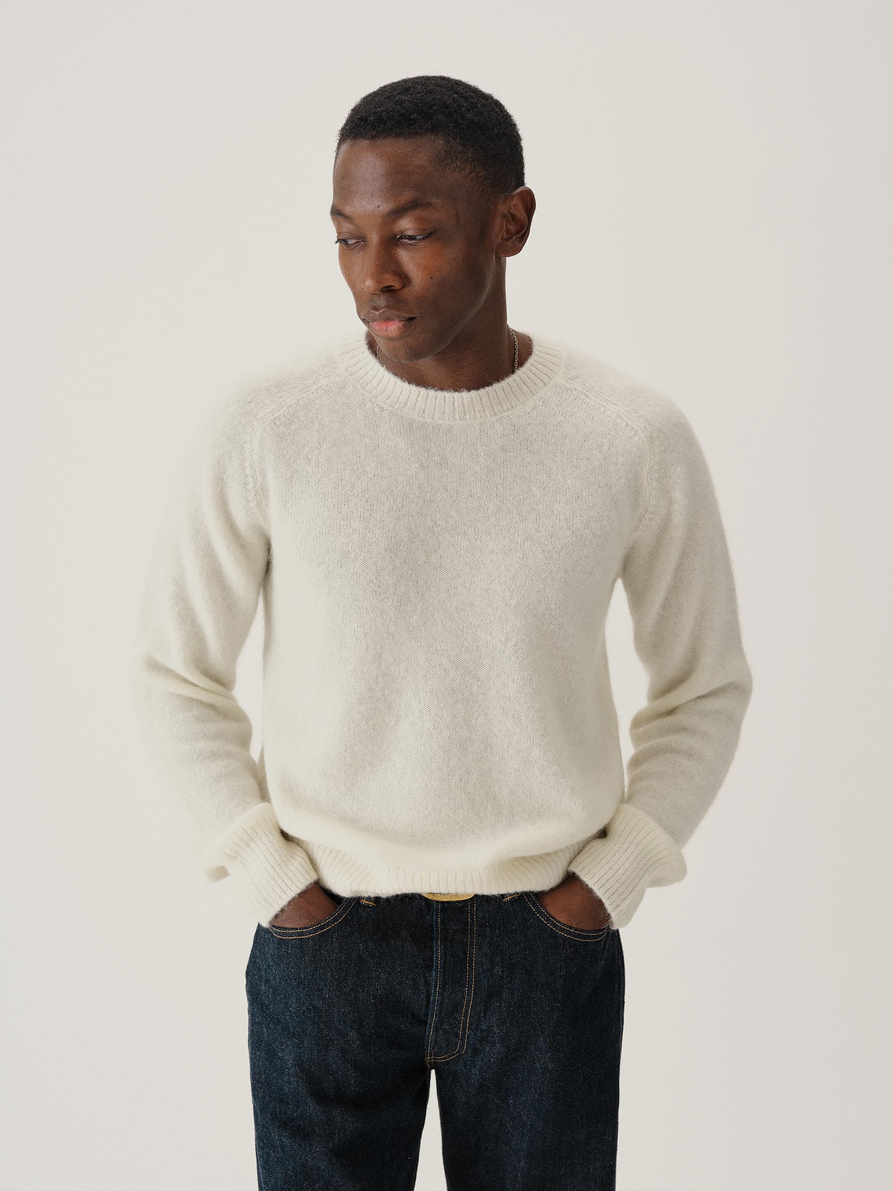 Our makers craft this sweater from a lofty blend of alpaca, recycled fibers, and wool, providing a plush, textured touch. The ribbed collar, cuffs, and hem are double-layered to help hold their shape.