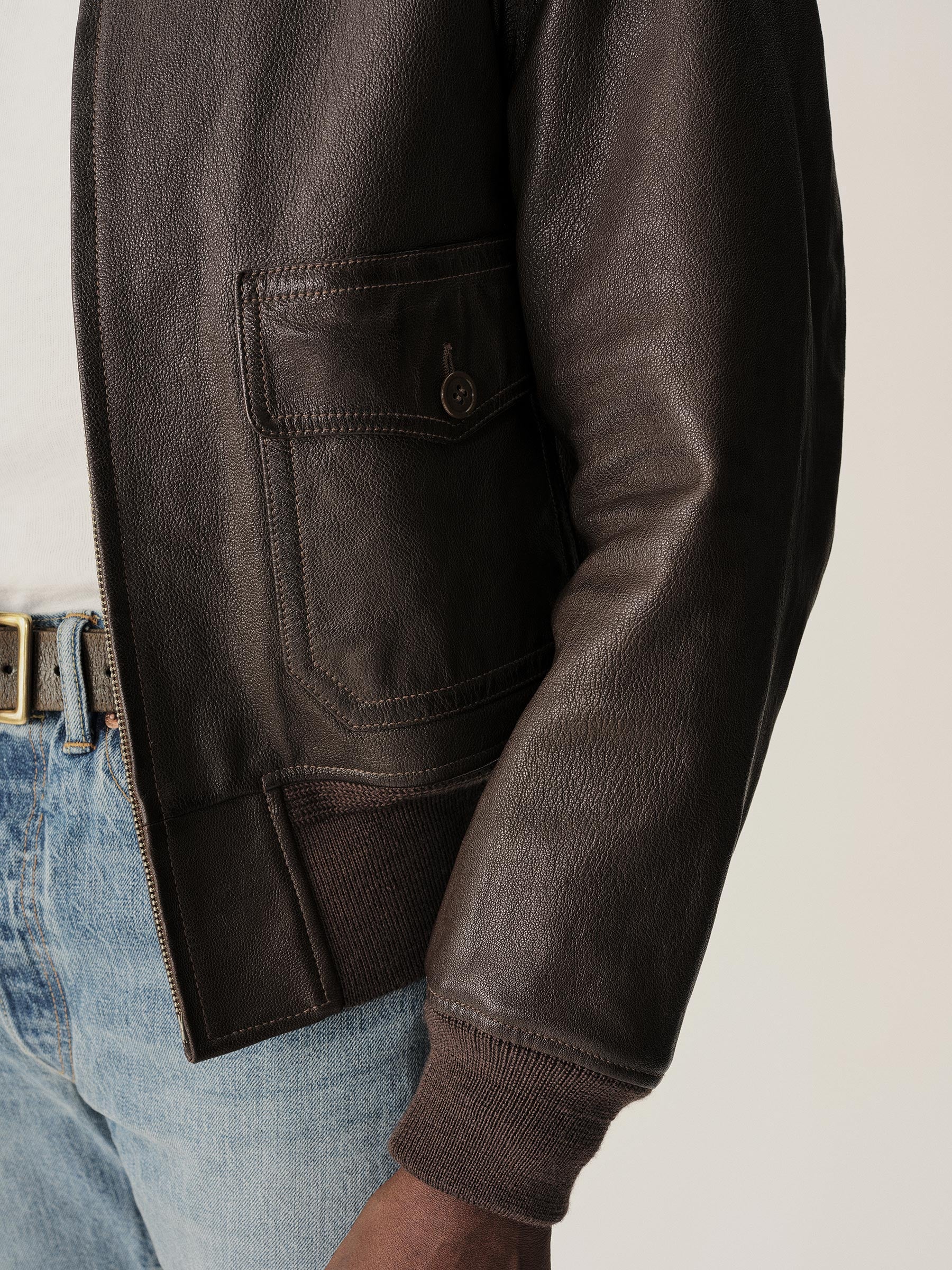 Few icons conjure the golden age of flight like the G-1 jacket, first developed by the US Navy in the 1930s, and we make ours with a vintage fit to match the classics. Crafted like the original with a goatskin body and a shearling fur collar, it will develop a handsome patina as it becomes a heritage piece of its own. The relaxed chest and ribbed details ensure a spot-on mid-century profile with ample comfort.