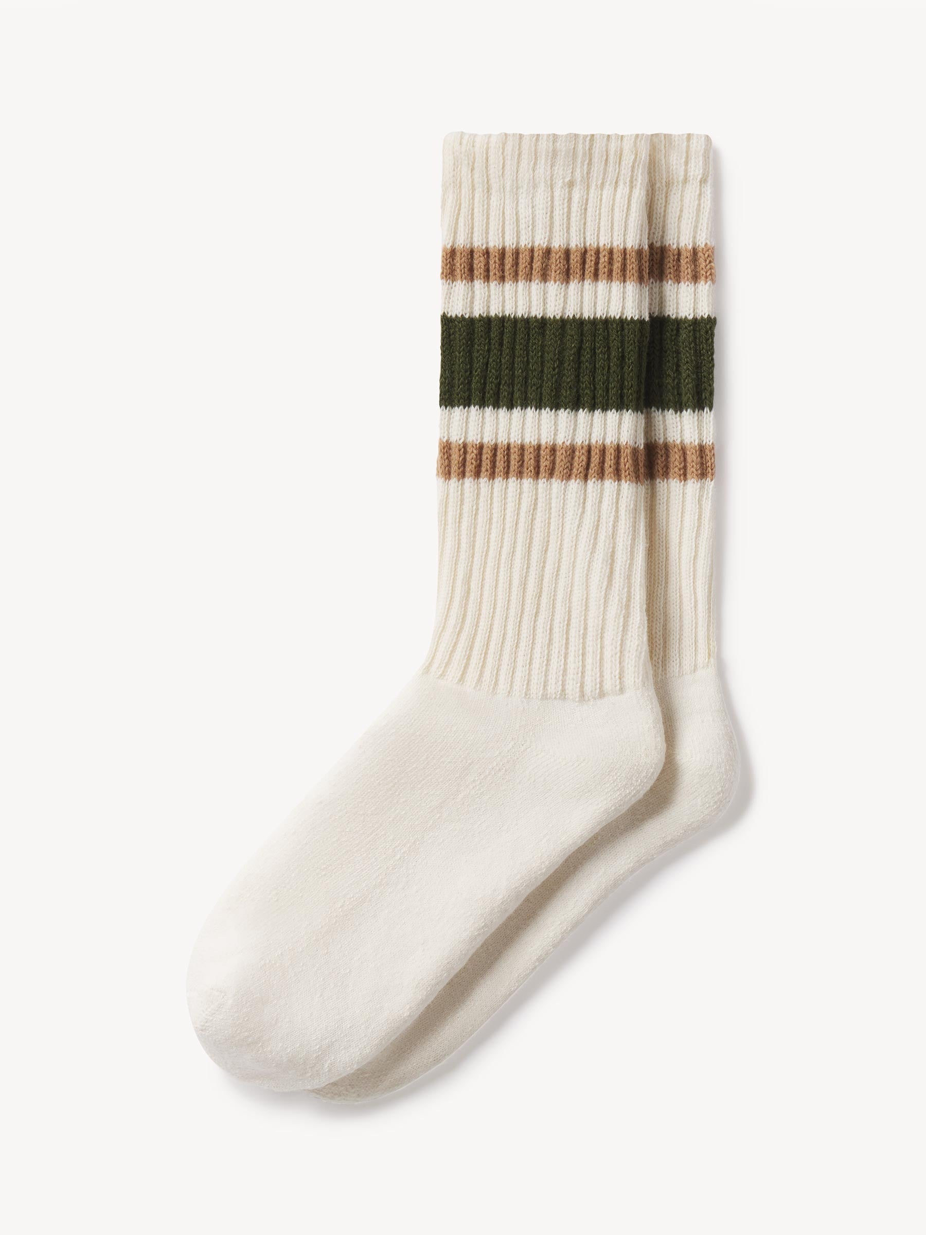 Thick sport socks made in the USA from American-grown cotton. Inspired by—and knit on the same style of machines as—original sport socks from the 80s. Details include a banded stripe and a soft-cushioned terry footbed.