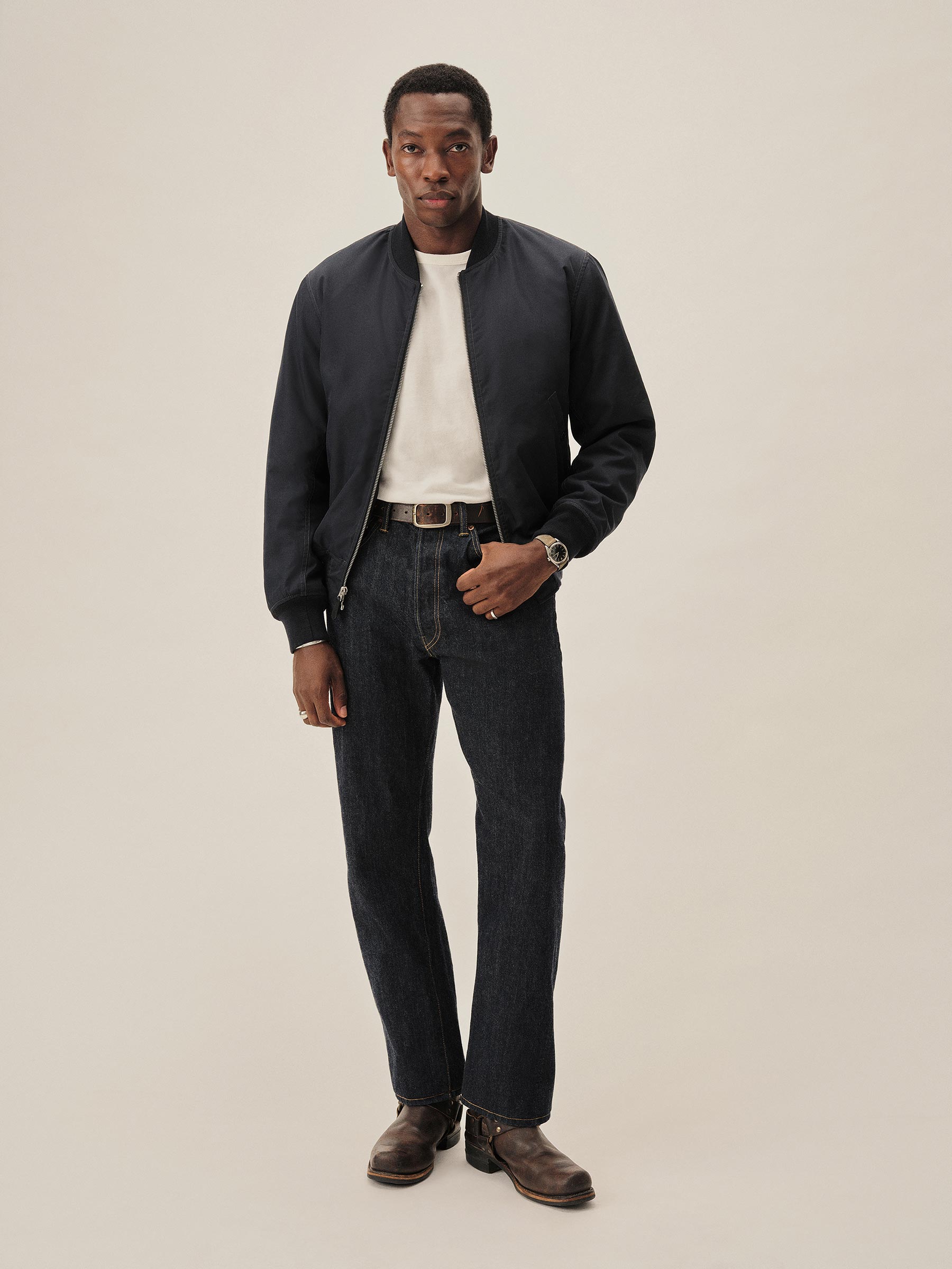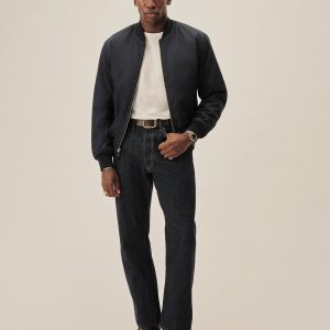 Classic fit, fully lined bomber jacket cut from a 5.5 oz. yarn-dyed cotton/poly twill with a durable water repellent finish. Details include angled flap hip pockets, ribbing at the collar, and articulated two-piece sleeves. Zip front closure. Insulated with PrimaLoft®.