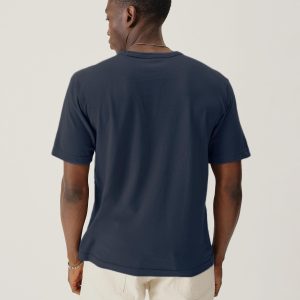 Cut from a midweight 200 GSM USA-grown cotton, developed, milled, and sewn at BM Knitting Mills in Mohnton, PA. This 90s-inspired boxy crewneck tee has a straight hemline, longer sleeves that hit lower on the bicep, and a wide ribbed collar. Bound neck and screen-printed label for comfort, constructed with a split-needle cover stitch at shoulders and armholes. Double-washed for a soft, smooth texture and consistent fit.