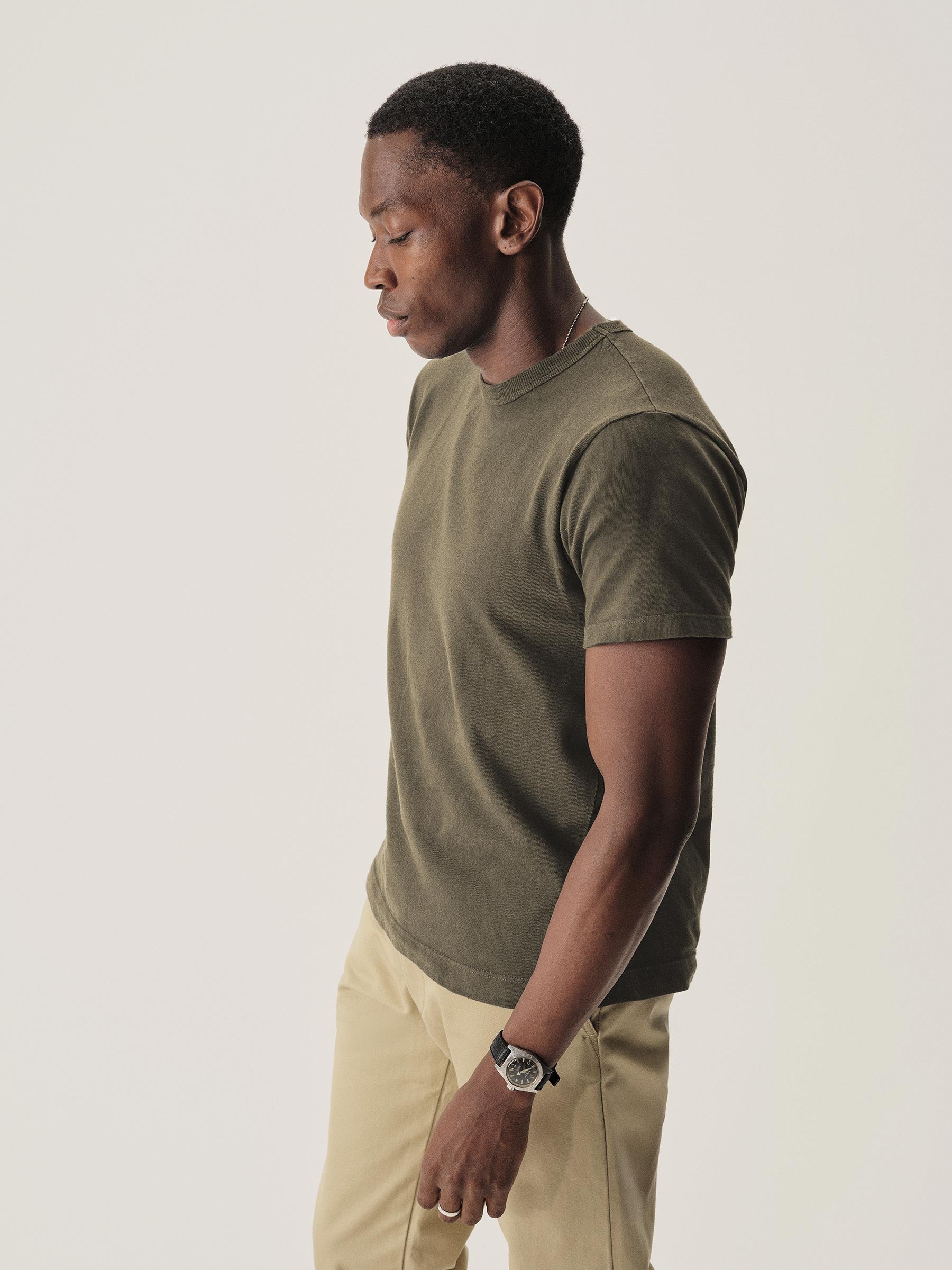 Cut from a midweight 200 GSM USA-grown cotton, developed, milled, and sewn at BM Knitting Mills in Mohnton, PA. This classic fit crewneck tee has a straight hemline, bound neck and screen-printed label for comfort. Constructed with a split-needle cover stitch at shoulders and armholes. Double-washed for a soft, smooth texture and consistent fit.