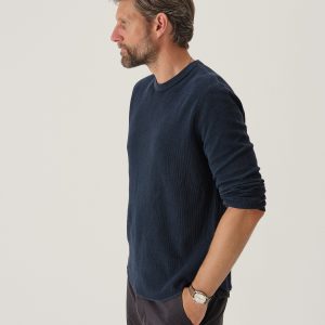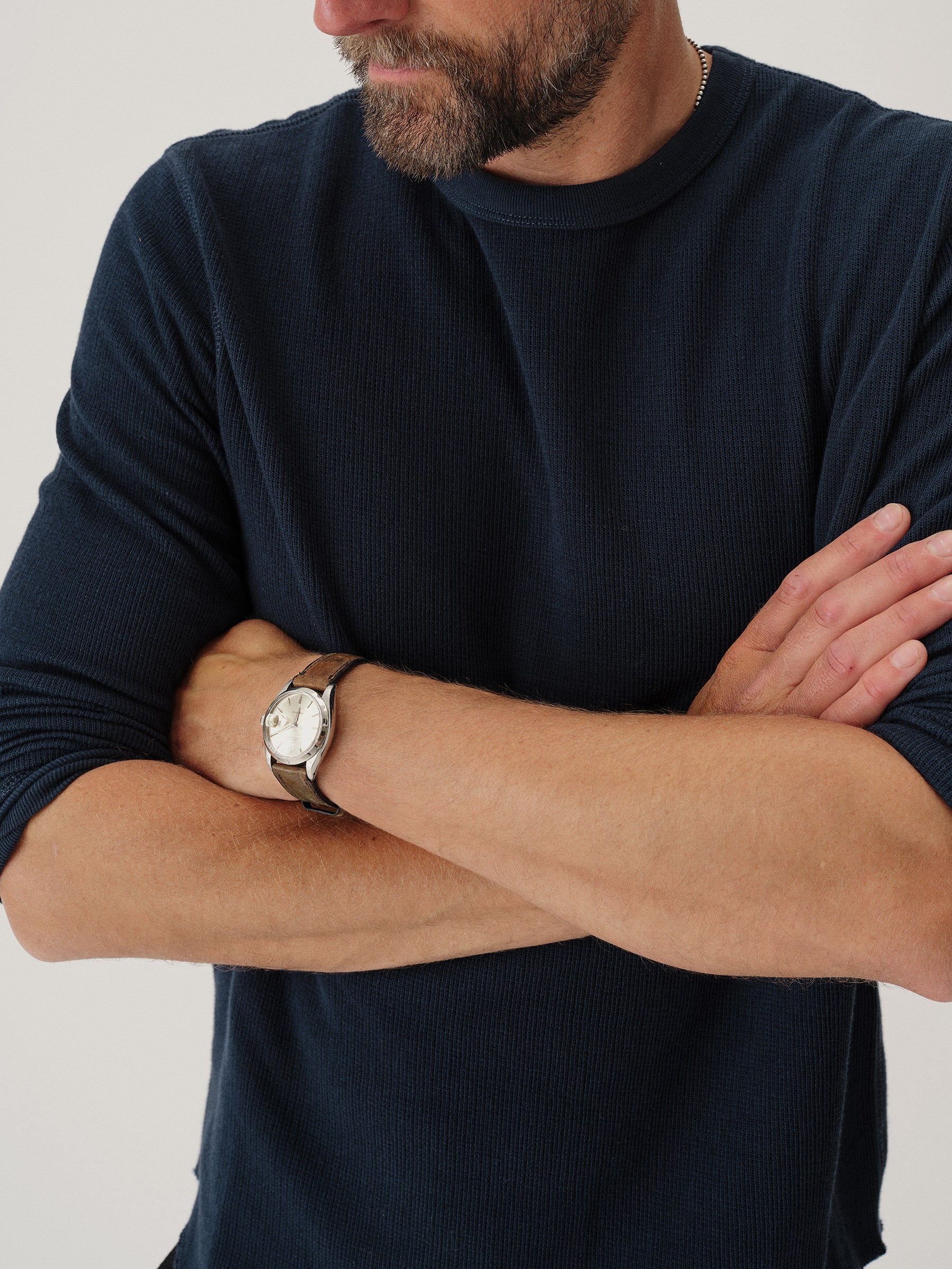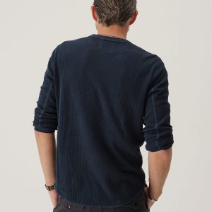 Classic fit thermal long sleeve crewneck tee with our signature curved hem. This 250 GSM French rib cotton double knit features a waffle-knit face and a smooth jersey back. Constructed with ribbed cuffs and flat-lock stitching throughout for improved comfort and durability. Garment washed with enzymes and softener for a lived-in feel.