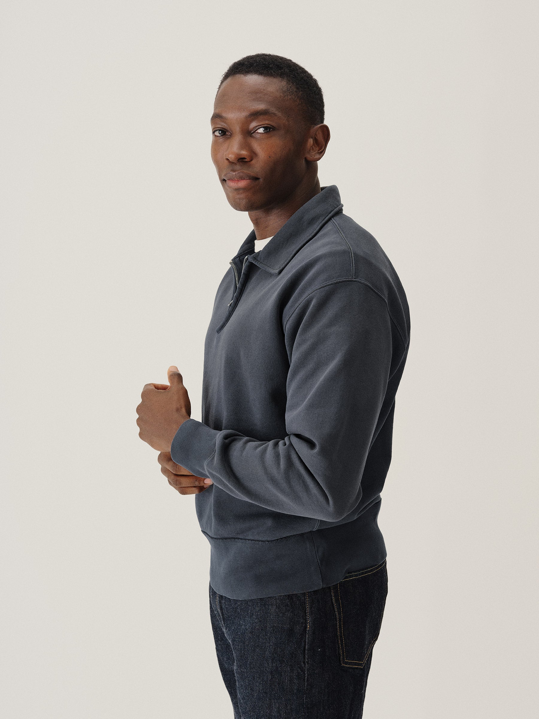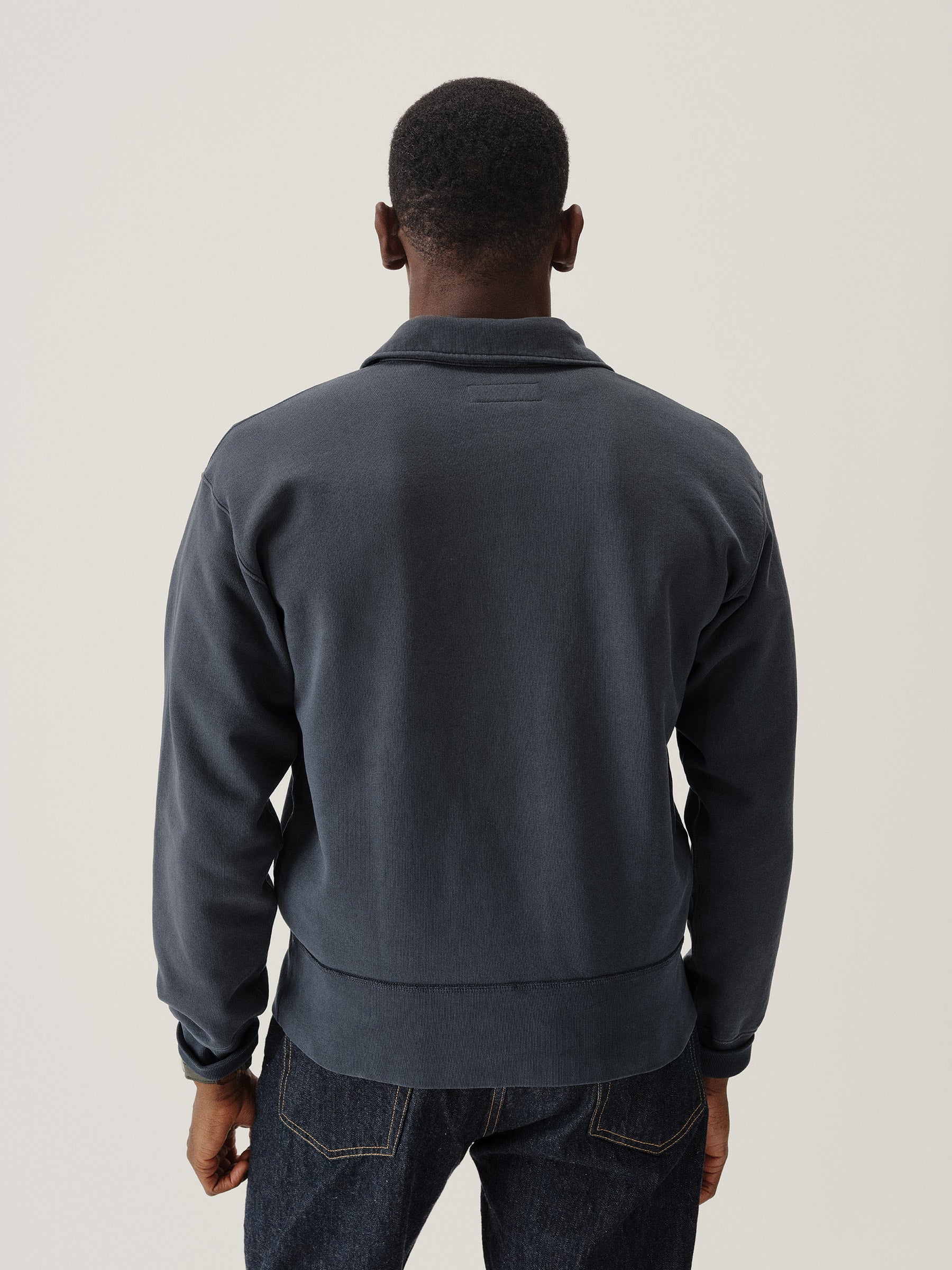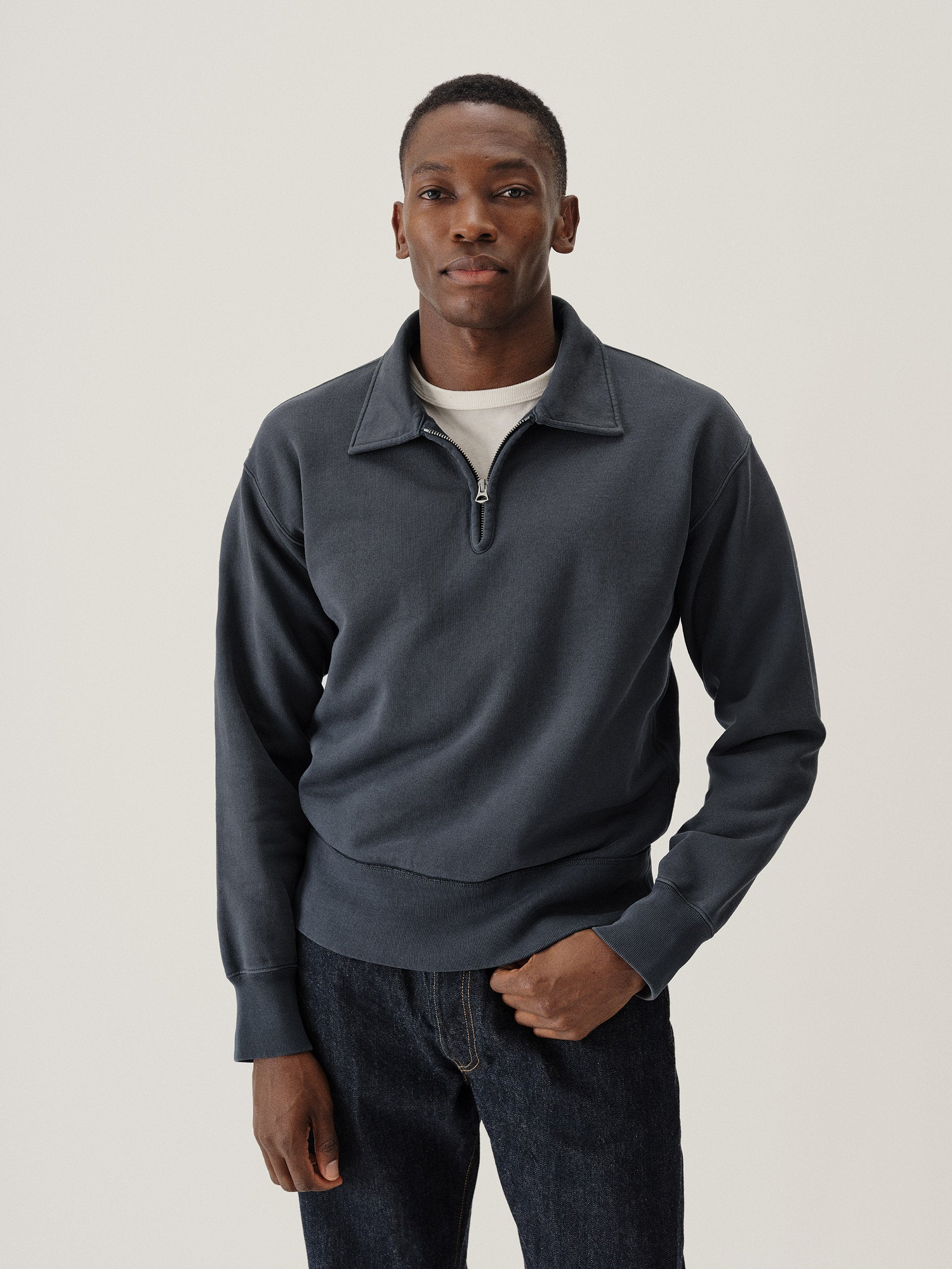 A midcentury-inspired quarter-zip collared sweatshirt made from plush, not-too-heavy, not-too-light, welterweight French terry. Features a foldover collar and front zip closure.
