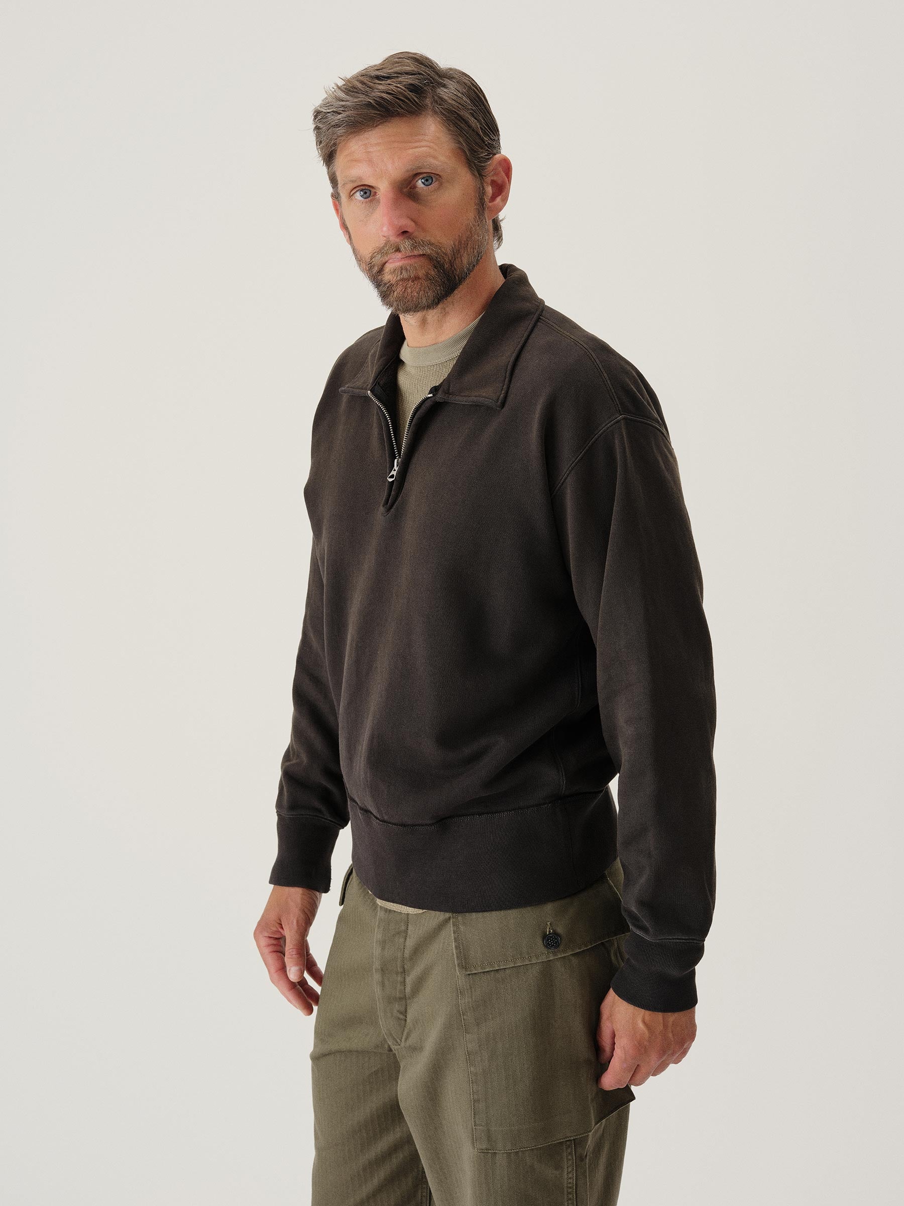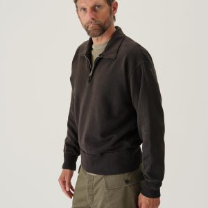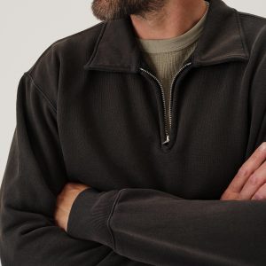 A midcentury-inspired quarter-zip collared sweatshirt made from plush, not-too-heavy, not-too-light, welterweight French terry. Features a foldover collar and front zip closure.